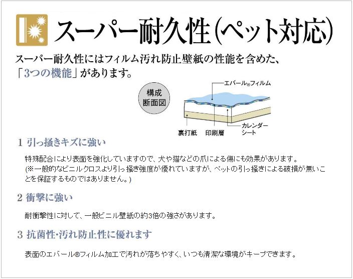 ペット対応製品には他にも、引っかき傷に強いものや、汚れがつきにくいものなど有ります。