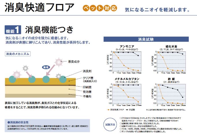 アンモニア臭に強い床材や、消臭機能がある壁紙や天井材などがあります。