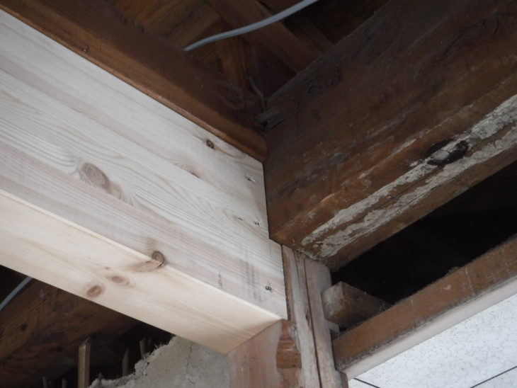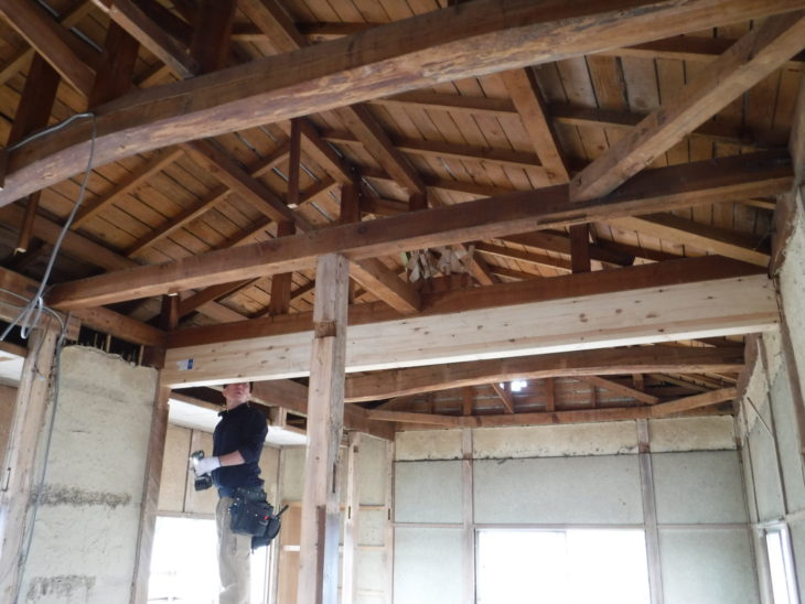 以前の記事でご紹介していた梁の補強を行いました。 柱がなくなった分、強力な張りを入れましたのでこれで安心です!