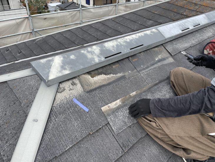 この建材はその施工の特徴上、棟板金廻りの箇所は釘などで固定できないため
