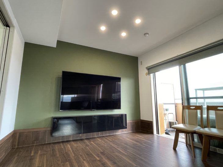 写真正面に見えるテレビもお打ち合わせさせていただき、テレビ設置時にコード類をすっきるさせる為に、壁面に工夫を施し、配線用の穴を壁に埋め込んでいます!