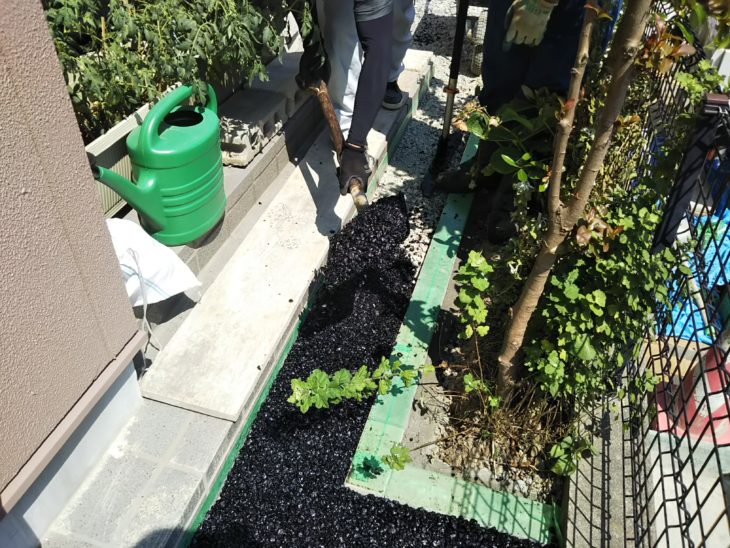 通常よりアスファルトの粒がゴロゴロしているのがお分かりいただけるでしょうか?透水アスファルトは路盤内に水が透過していくため、併せて暗渠パイプを敷設するのがお勧めです!今回の現場でも敷設させて頂いております。