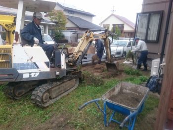 テラス廻りの庭には芝を張り込む予定です。重機を入れて雑草を撤去していきます。
