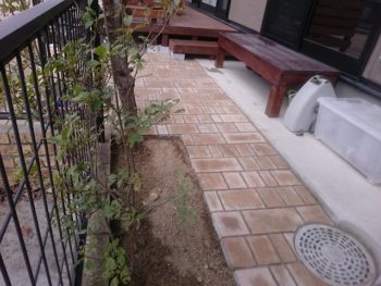 門扉からデッキバルコニーに続くアプローチにインターロッキングを敷きました。アンティーク調で素敵です。
