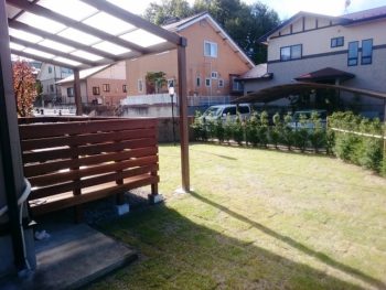 テラス屋根から程よく日光が透けて気持ちのよいスペースです。芝生もキレイに敷けています。